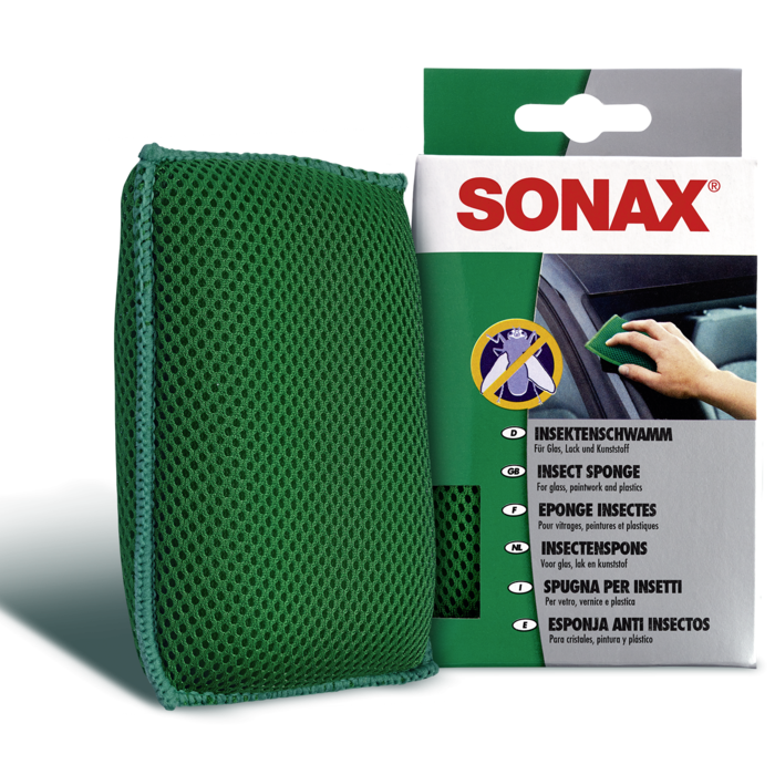 Sonax Insektenschwamm removes bugs from car surfaces. This sponge gently cleans paint and glass, preventing scratches while removing insects. Ideal for pre-wash bug cleaning.