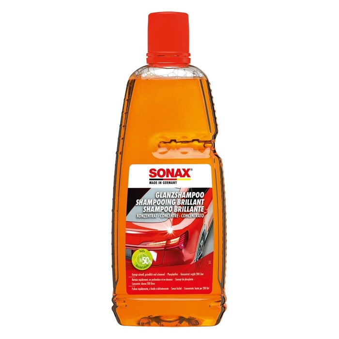 The Sonax Gloss Shampoo Concentrate 1000ml gently cleans paint, glass, and more with a pH-neutral, phosphate-free formula, preserving wax protection.
