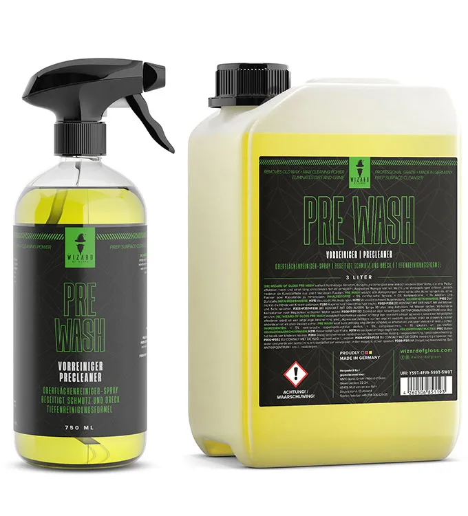 Prep your car with Wizard of Gloss Pre Wash Vorreiniger 750ml, 3L. This pre-wash cleaner removes dirt, grime, and road film, making washing easier. Perfect for a thorough, professional-grade clean before the main wash, protecting your paint.
