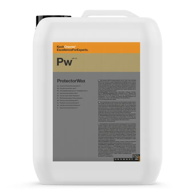 Koch Chemie Pw ProtectorWax Wachsversiegelung 10L protects car paint with a durable wax layer. This 10L solution repels water and dirt, ensuring a long-lasting shine. Ideal for large-scale exterior car care.