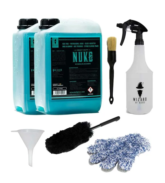 Clean wheels with Wizard of Gloss Nuke Felgenreinigungsset. This set includes products to remove brake dust and grime, ensuring a spotless finish. Perfect for all wheel types, it delivers a professional-grade, scratch-free clean.